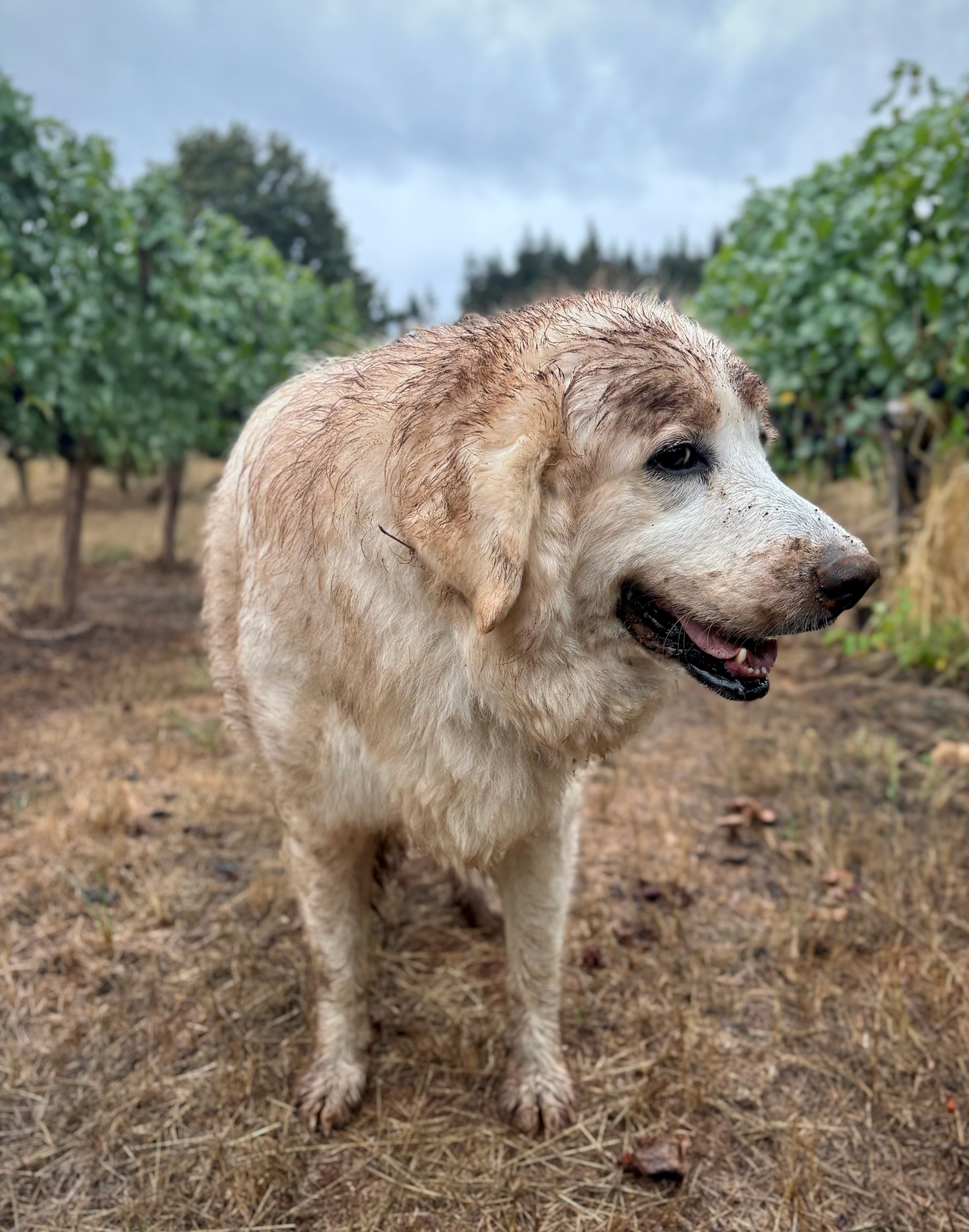 Julia works the vineyards with the assistance of her dog "Rosie" - a rescue from the Great Pyrenees Rescue Society in TX. Rosie is thriving in the Oregon climate and enjoys watching over the vineyards with her owner.